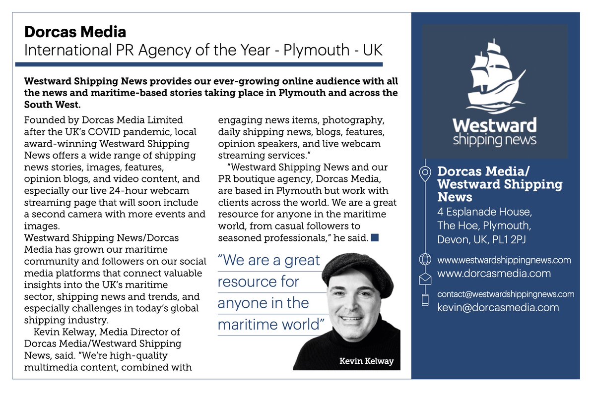 Westward Shipping News Dorcas Media are proud to be showcased in the 2025 global LE100 online and printed magazine for winning International PR Agency of the Year-Plymouth-UK.