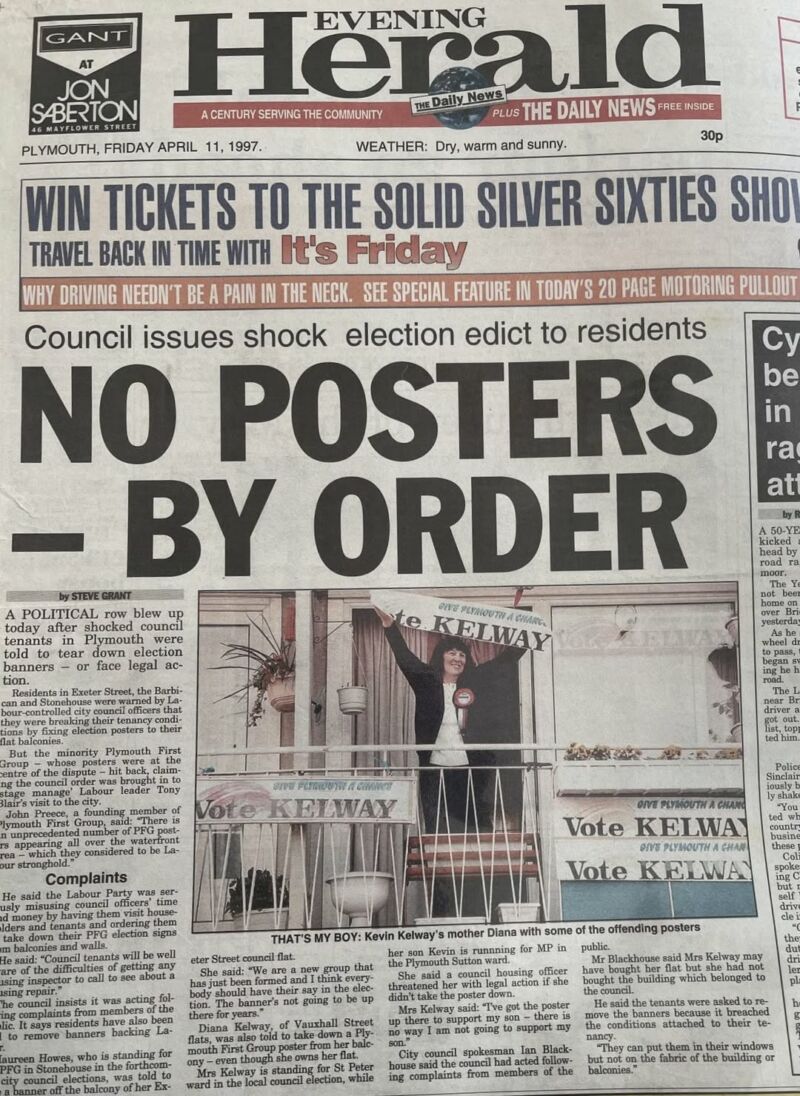 My dear Mammy made the front page of the Herald dated 11th April 1997 when I stood for the first time as an independent candidate - before I joined the Plymouth Conservatives in 1999.