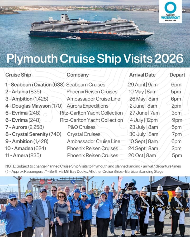 Tourist bosses in Falmouth are expected to welcome up to 80,000 passengers, thousands of crew members, and 50 ships booked to visit the historic port in 2026.