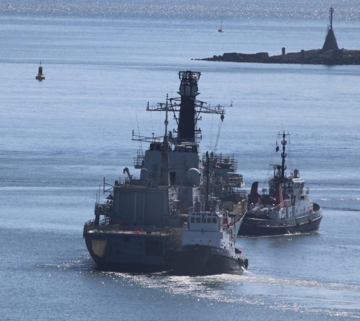 Ex-HMS Westminster was spotted on our webcam this week being towed out of the Sound by Serco Group tugs on its way to Portsmouth to