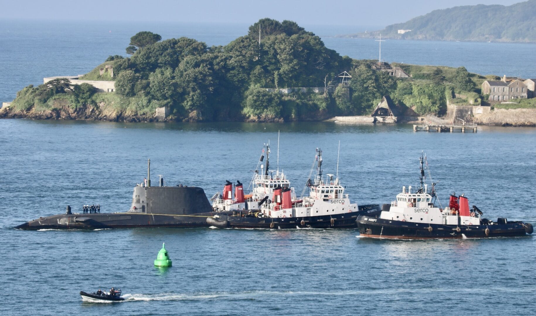 The Royal Navy attack submarine HMS Astute was spotted on our live webcam early this morning leaving the Sound and returning to sea. The usual