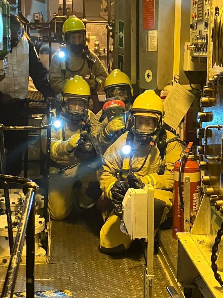 HMS Kent ship’s company practicing its reactions to a Main Machinery Space Fire to ensure everyone on board knows what to do in the event, and all part of the ship’s essential preparation for Operational Sea Training now starting.