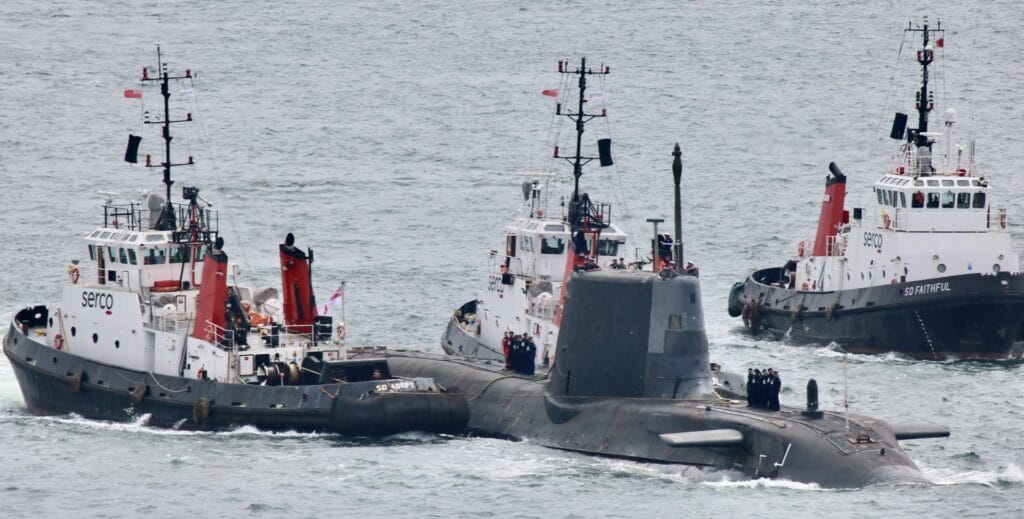 Serco Group vessels and police patrol boats escorted the British submarine into HMNB Devonport. HMS Anson is possibly deployed to protect #CSG25 with carrier HMS Prince of Wales.