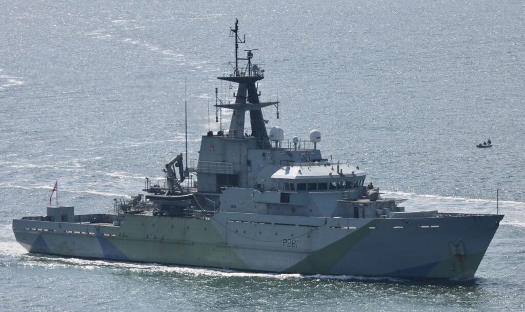Local fishermen in a small craft were warned by the Police to move out of the way from the approaching HMS Tyne on its way into Devonport this afternoon.