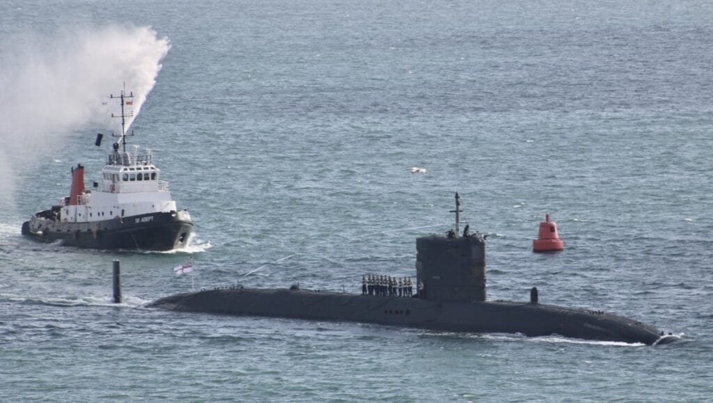 The submarine proudly flew her paying off pennant and the crew ‘were on top’ to line the casing as it sailed past Plymouth’s famous Hoe.