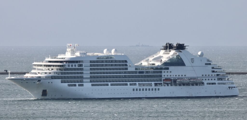 The city’s first luxury cruise liner of 2026, the Bahamas-registered Seabourn Ovation, arrived in the Sound early this morning under the watchful eye of HMS Sutherland in the distance @FOST training activities.