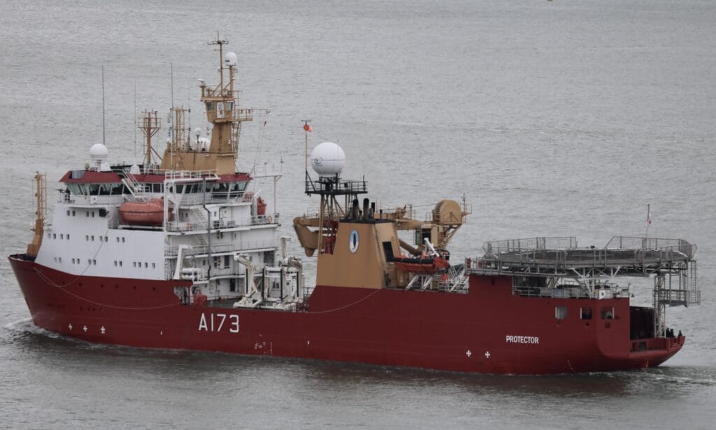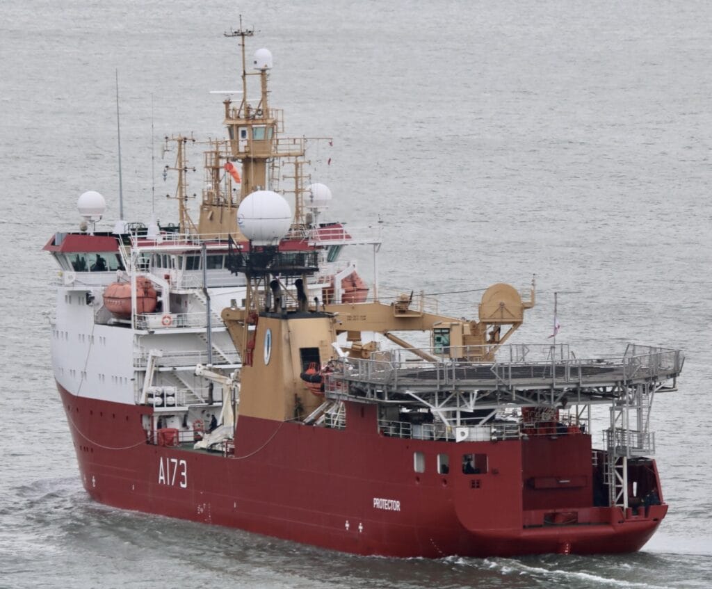 Our live webcam spotted HMS Protector, the Royal Navy’s ice patrol ship, outbound in the Sound today.
