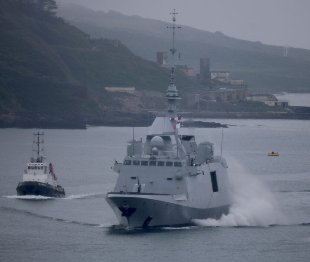 The FS Bretagne on a port visit to HM Naval Base Devonport this morning in the mist and rain, getting ready for the French led #Polaris25 exercise in the West Atlantic with the helicopter carrier FS Tonnerre beyond the Plymouth breakwater.